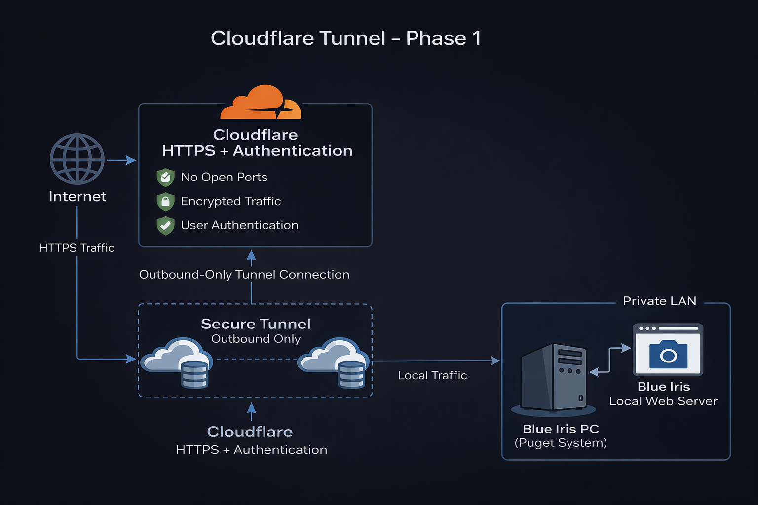 Internet ↓ Cloudflare (HTTPS + Authentication) ↓ Secure Tunnel (Outbound Only) ↓ Blue Iris PC (cloudflared) ↓ Blue Iris Web Server
